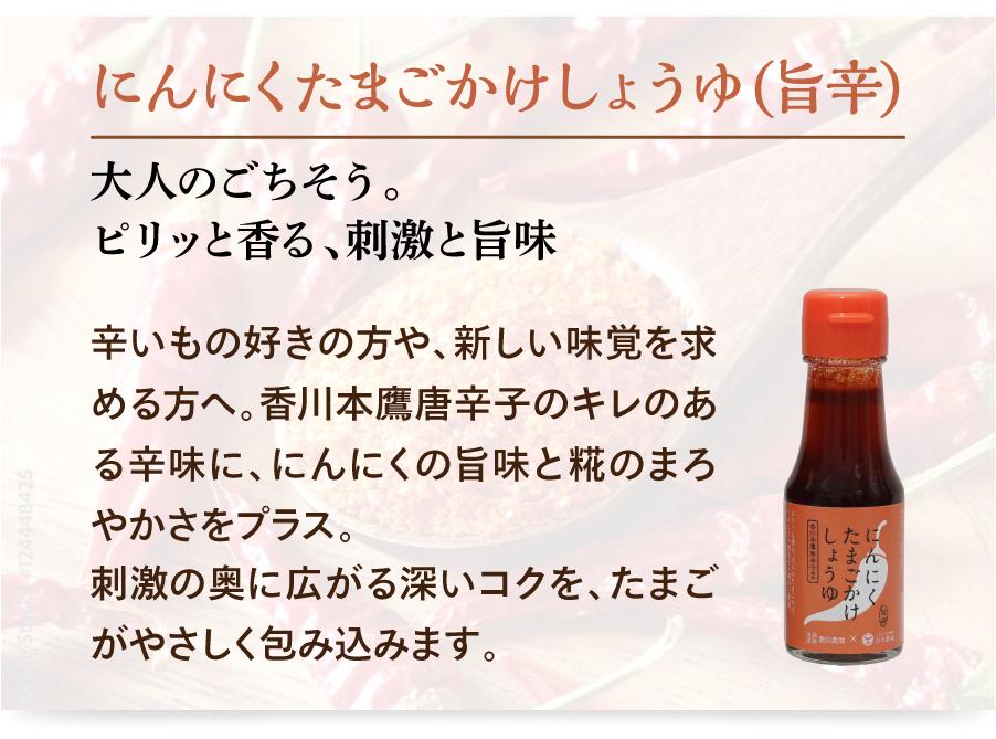 【にんにくたまごかけしょうゆ (唐辛子入り)】